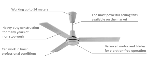 je určen do místností o výšce stropu do 14 m, doporučená maximální plocha pro jeden ventilátor je 470 m2.